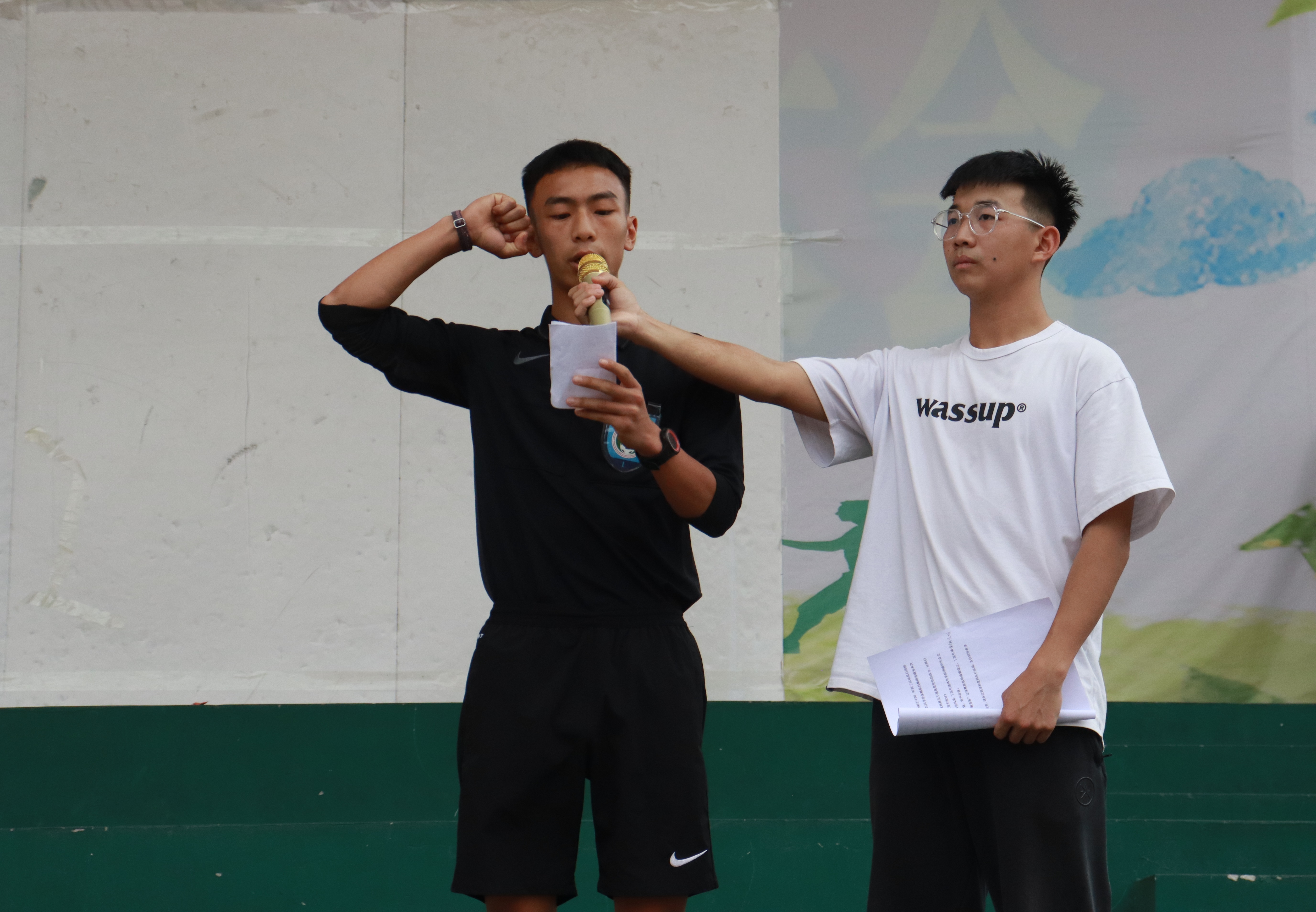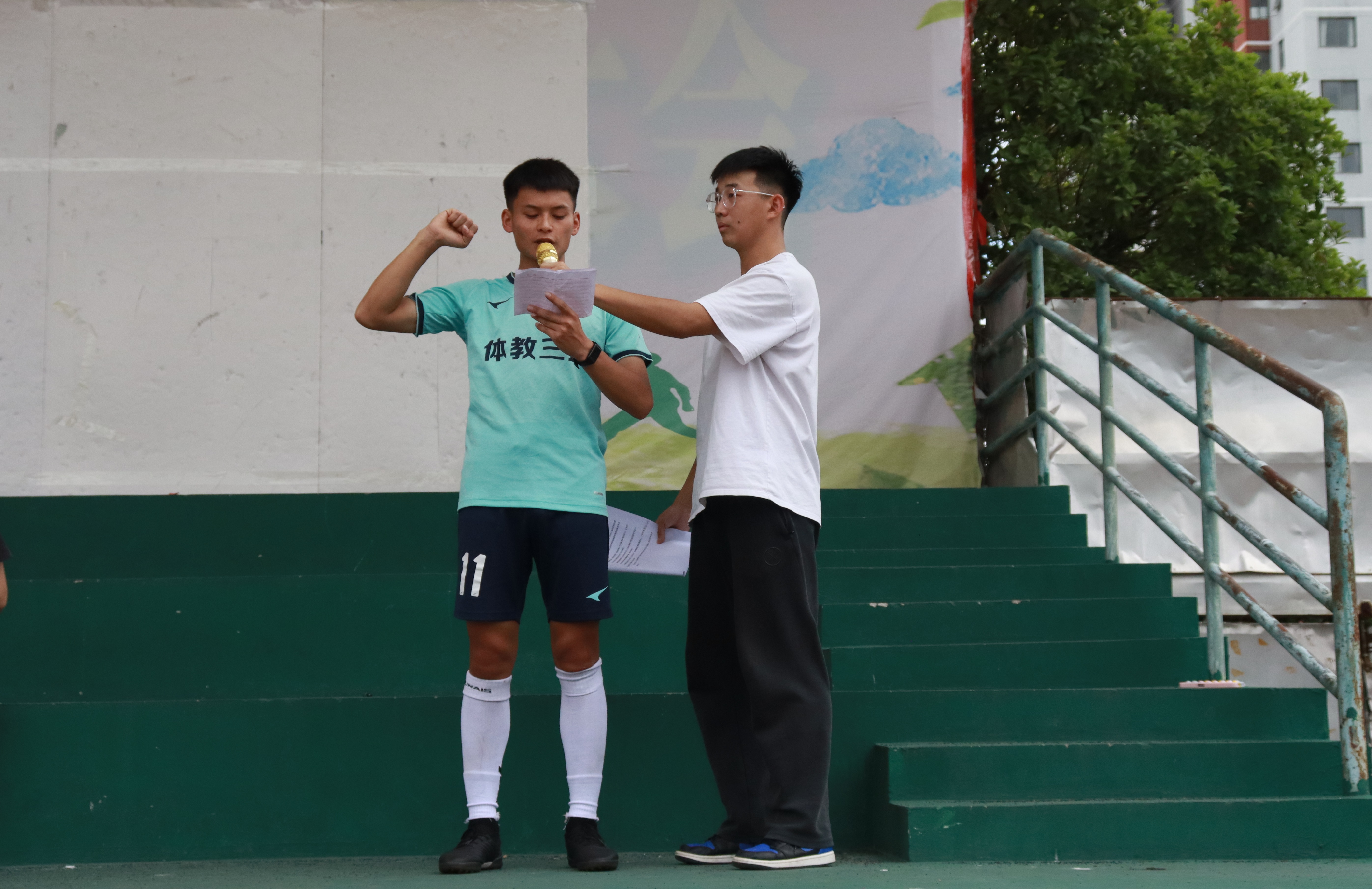首先,全体起立,奏唱中华人民共和国国歌;随后,韩山致欢迎词,对本届足球盛会表示衷心的祝贺,对为筹备比赛付出辛勤劳动的工作人员表示诚挚的感谢,期望大家以比赛为契机,充分展示自身所学技能,增进与各班级间、各公司间的交流学习,并共同推动公司体育事业的发展,期望全体运动员严守赛风赛纪、尊重裁判、尊重对手、尊重观众,用精彩的比赛彰显足球运动魅力,把本届比赛办成一次“安全、和谐、团结、精彩”的盛会。裁判员代表孙成坤和运动员代表云明才分别进行庄严宣誓。