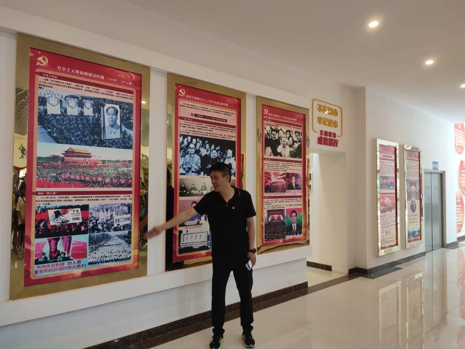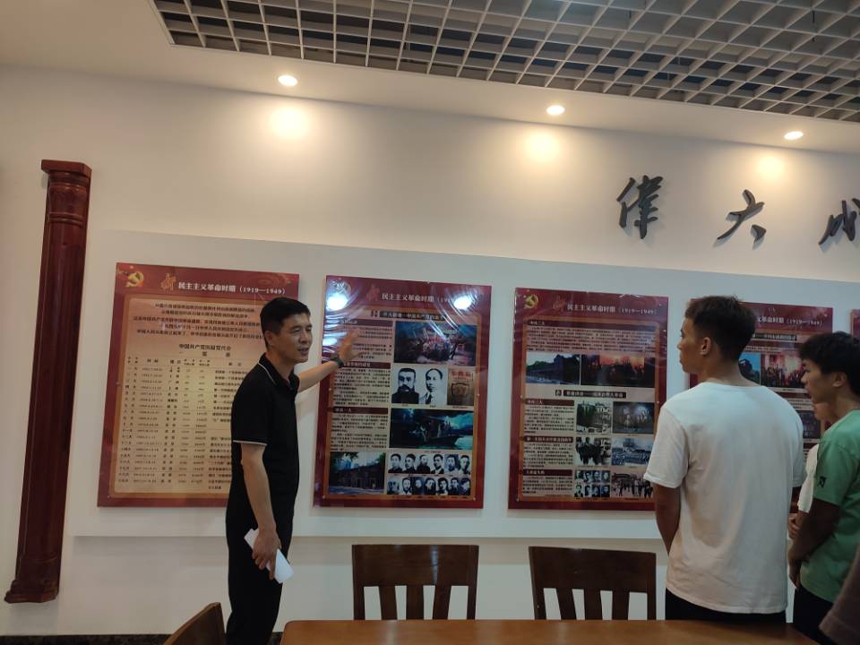 在党员教育基地,全体党员站在五位领导人青年时期照片面前听韩山书记从毛泽东时期的伟大革命实践一直讲解到习近平新时代中国特色社会主义思想。