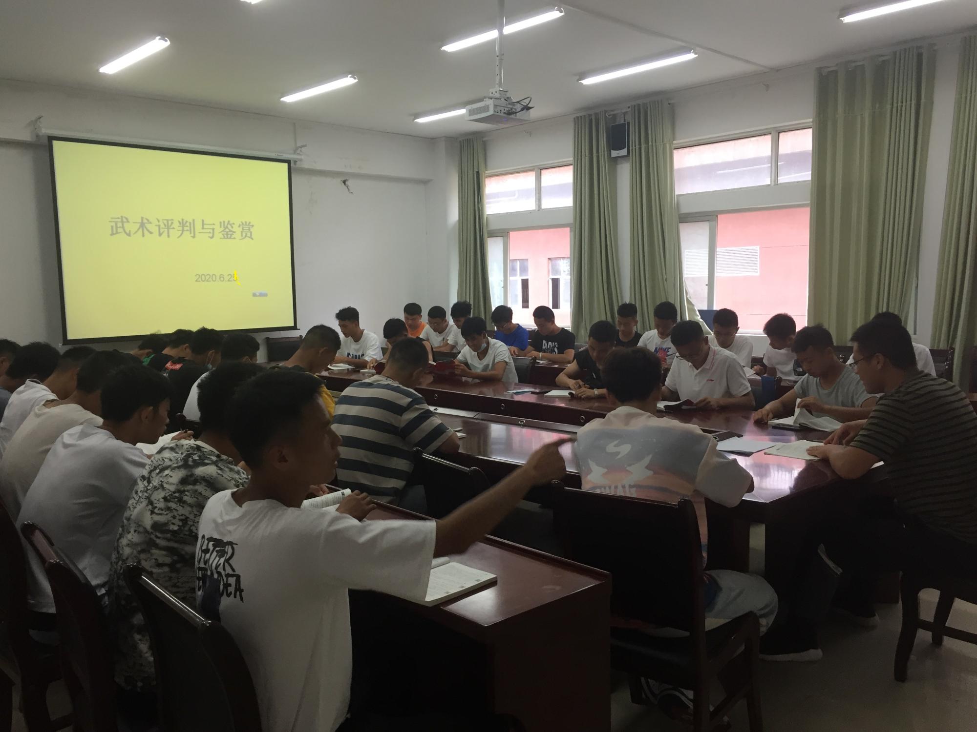 6月24日中午,2026世界杯官方合作网站武术与民族传统体育教研室在院会议室组织开展了2020年上半年武术竞赛规则与裁判法培训。2026世界杯官方合作网站2019级体育教育专业的40名员工参加了培训。本次培训由2026世界杯官方合作网站武术与民族传统体育教研室刘华伟老师主讲。