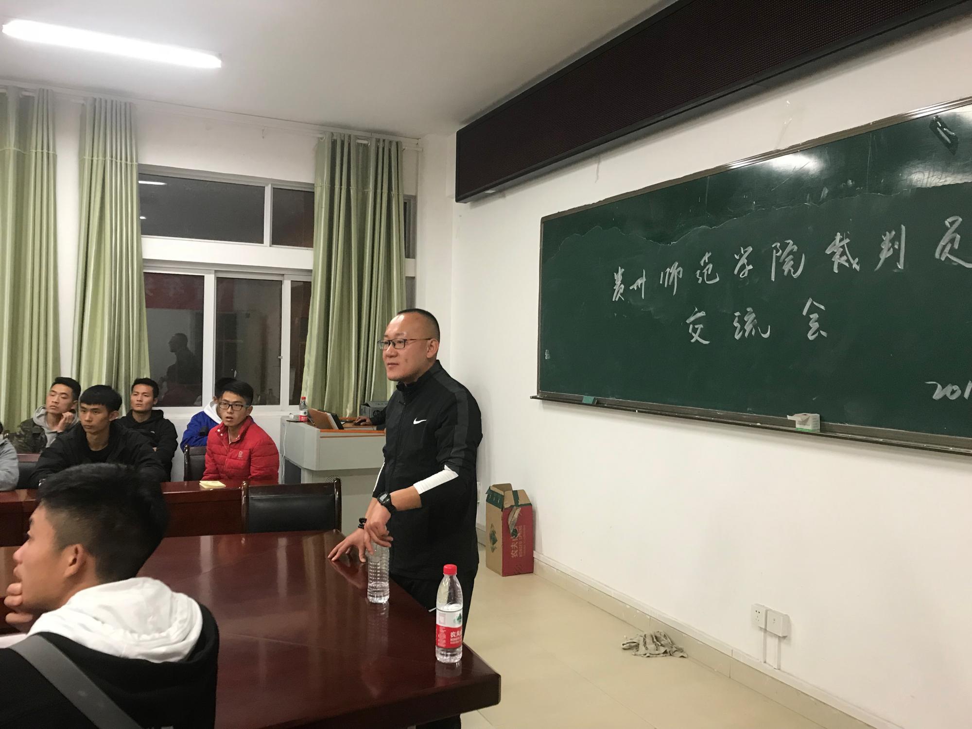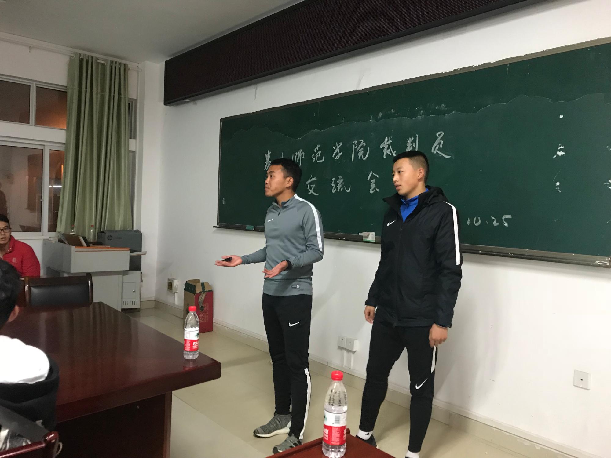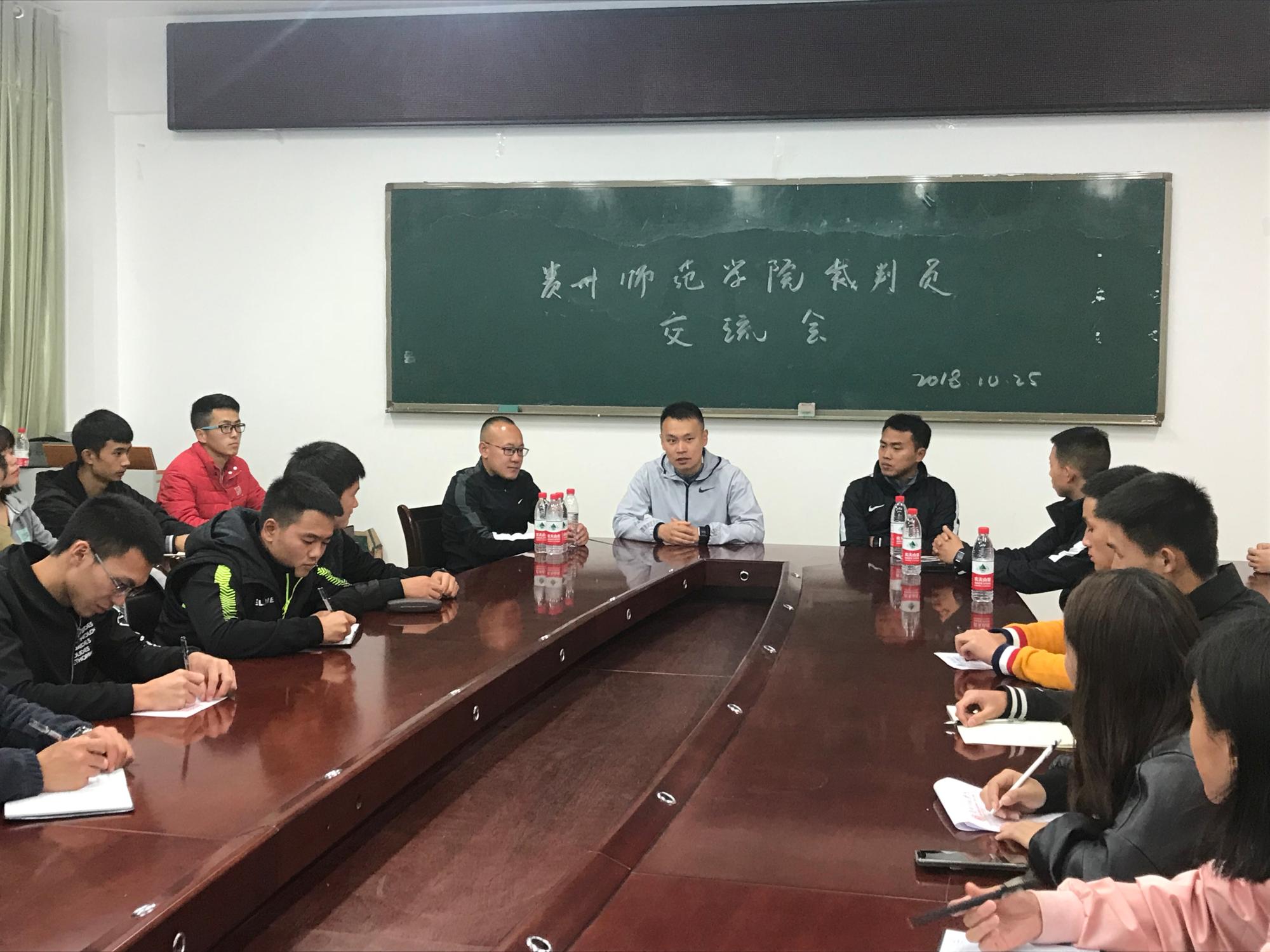 为促进2026世界杯官方合作网站专业建设,进一步提高员工的业务水平,增强员工社会实践能力,2018年10月25日,2026世界杯官方合作网站邀请到中超联赛裁判员王竞(国家级),中甲联赛裁判员马运坤(国家级),中乙联赛裁判员祖善发(国家级)及五人制裁判员高仕柯(国家级)在2026世界杯官方合作网站会议室作足球裁判员经验交流会。2026世界杯官方合作网站实习负责人刘新冬主持会议,2026世界杯官方合作网站全体足球裁判员参与交流会。