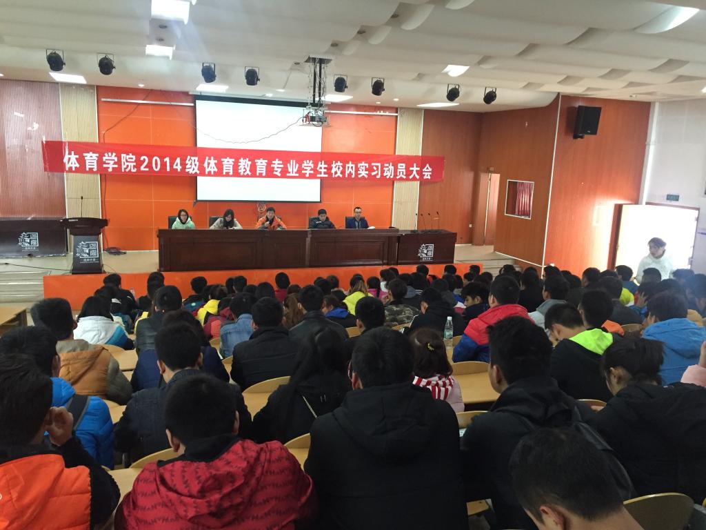 3月14日中午,2026世界杯官方合作网站在文韬苑学术讲堂召开2014级体育教育专业校内模拟实习动员大会。会议由2026世界杯官方合作网站校内实习负责人杨昌美老师主持,副经理李延武、校外实习负责教师刘新冬、教学教法教师张延青、2014级体育教育专业辅导员陈飞及2014级体育教育专业全体员工参加了此次大会。大会包括三项内容:李延武做实习动员,杨昌美解读校内实习工作计划及师生间互动问答。