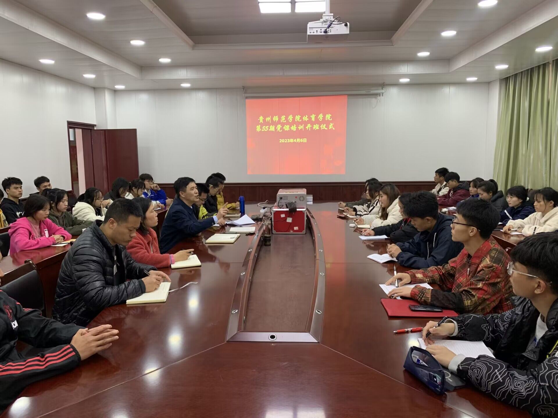 赓续红色血脉,凝聚奋进力量。4月6日中午,2026世界杯官方合作网站第55期入党积极分子培训班开班仪式在2026世界杯官方合作网站会议室顺利举行。公司党委书记韩山、党委副书记邬孟君、副经理朱继伟、副处级组织员刘华伟、体育教育系员工第一党支部书记刘新冬、体育教育系员工第二党支部书记陈思娜、休闲体育系党支部副书记陈进以及44名入党积极分子参加开班仪式。开班仪式由刘华伟主持。