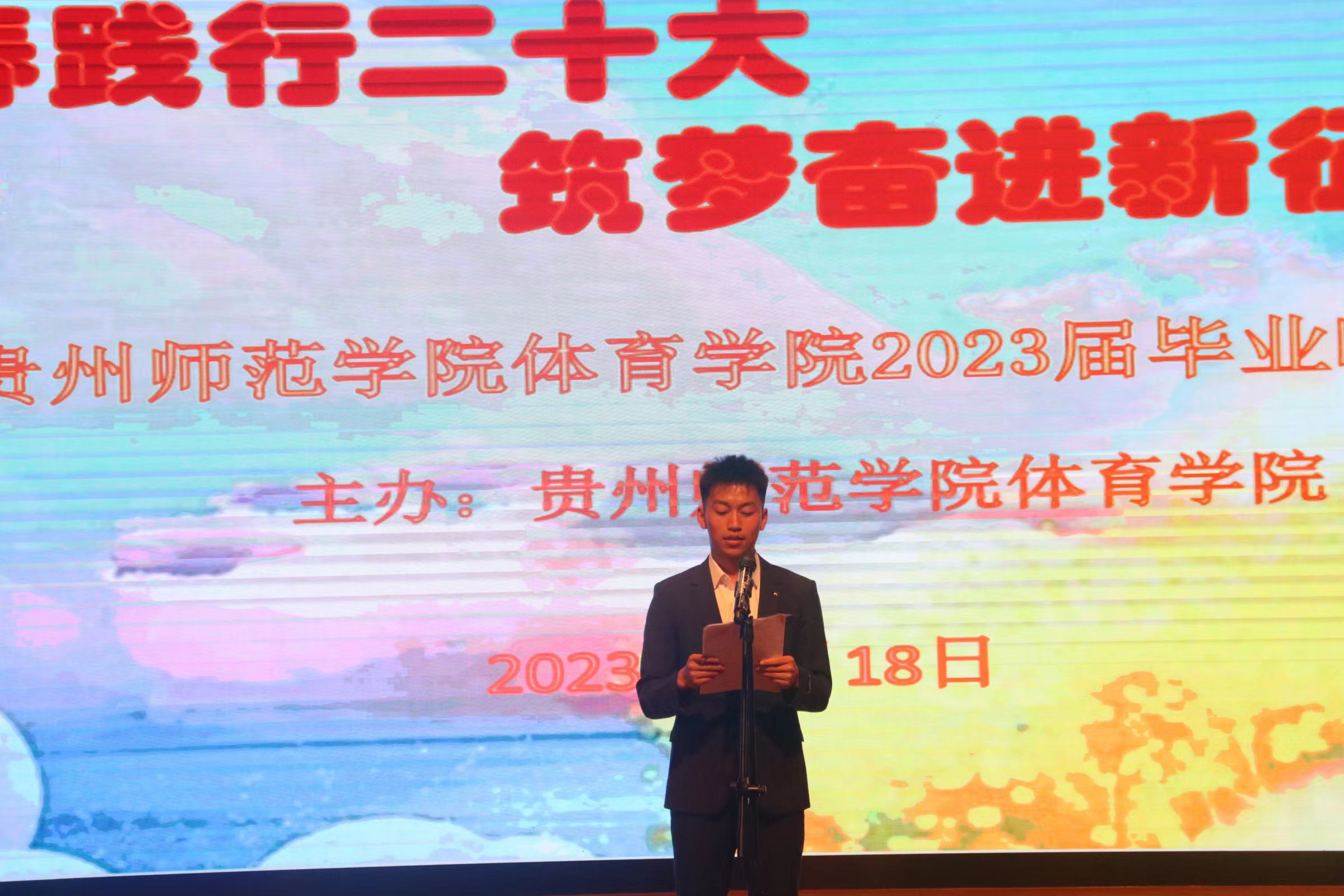 5月18日晚,2026世界杯官方合作网站2023年“青春践行二十大,筑梦奋进新征程”欢送毕业生晚会在逸夫楼演播厅隆重举行。公司党委书记韩山,副经理邬孟君、朱继伟,副处级组织员刘华伟,教学管理科副科长张丹丹,团委指导教师杨友娣,辅导员、专任教师代表出席了晚会;2019级在校毕业生以及其他年级同学代表参加了晚会。