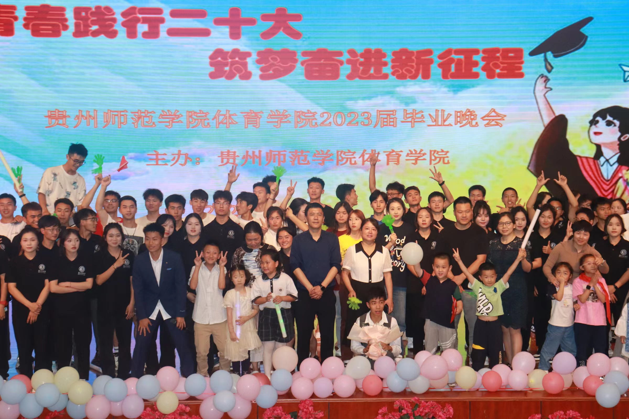 毕业视频播放完毕,晚会正式开幕。晚会节目形式多样,内容丰富,各个节目独具特色与魅力,充满青春色彩。在活力四射的开场舞《歌舞青春》之后,龙师协会的《舞龙舞狮》精彩表演赢得全场喝彩。来自乌当区特殊教育公司的查鉴航同学为大家带来精彩的架子鼓表演《非洲之歌》和《骄傲的少年》,现场掌声不断。来自员工会舞蹈节目《shooting star》,20级、21级健美操专选班的健美操和啦啦操精彩表演,展示体育之美,展现青春活力。严江老师和19级毕业生组合的歌曲串烧《回忆那么伤➕后来》,自编自唱歌曲《晚点》传达出师生之间洋溢的热情。体育舞蹈协会的精彩节目《伴》,使同学们感受到了体育与舞蹈相结合的柔和美。活动特邀来自音乐与舞蹈公司的“森巷乐队”,演奏的《月牙湾》与《爱人错过》以乐器与歌声结合的精彩表演带动全场。21级休闲体育班健身健美专选的同学《健身健美造型展示》将晚会推向高潮。花样跳绳协会带来《花样跳绳》的精彩表演,配合默契十足且具有美感,精彩表演同学们使大饱眼福。