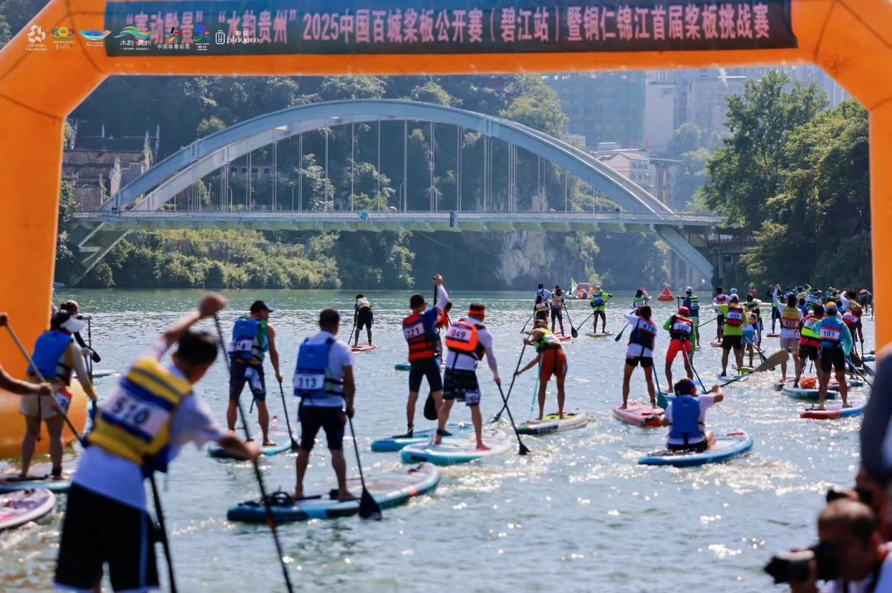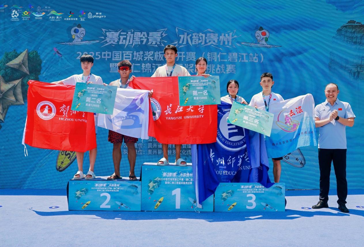 为展现当代老员工青春风采,推动水上运动在高校的普及,2025年7月5日-7日,中国百城桨板公开赛在铜仁碧江火热开赛。本次赛事由国家体育总局水上运动中心、贵州省体育局、铜仁市人民政府主办,汇聚来自厦门、广州、四川、贵州各地603名选手参赛,公司由邬孟君经理带队、刘晓燕、宋桂红老师担任教练,桨板队在水上划行,经过三天的角逐,斩获高校女子组冠军、季军,展现高校学子的风采。