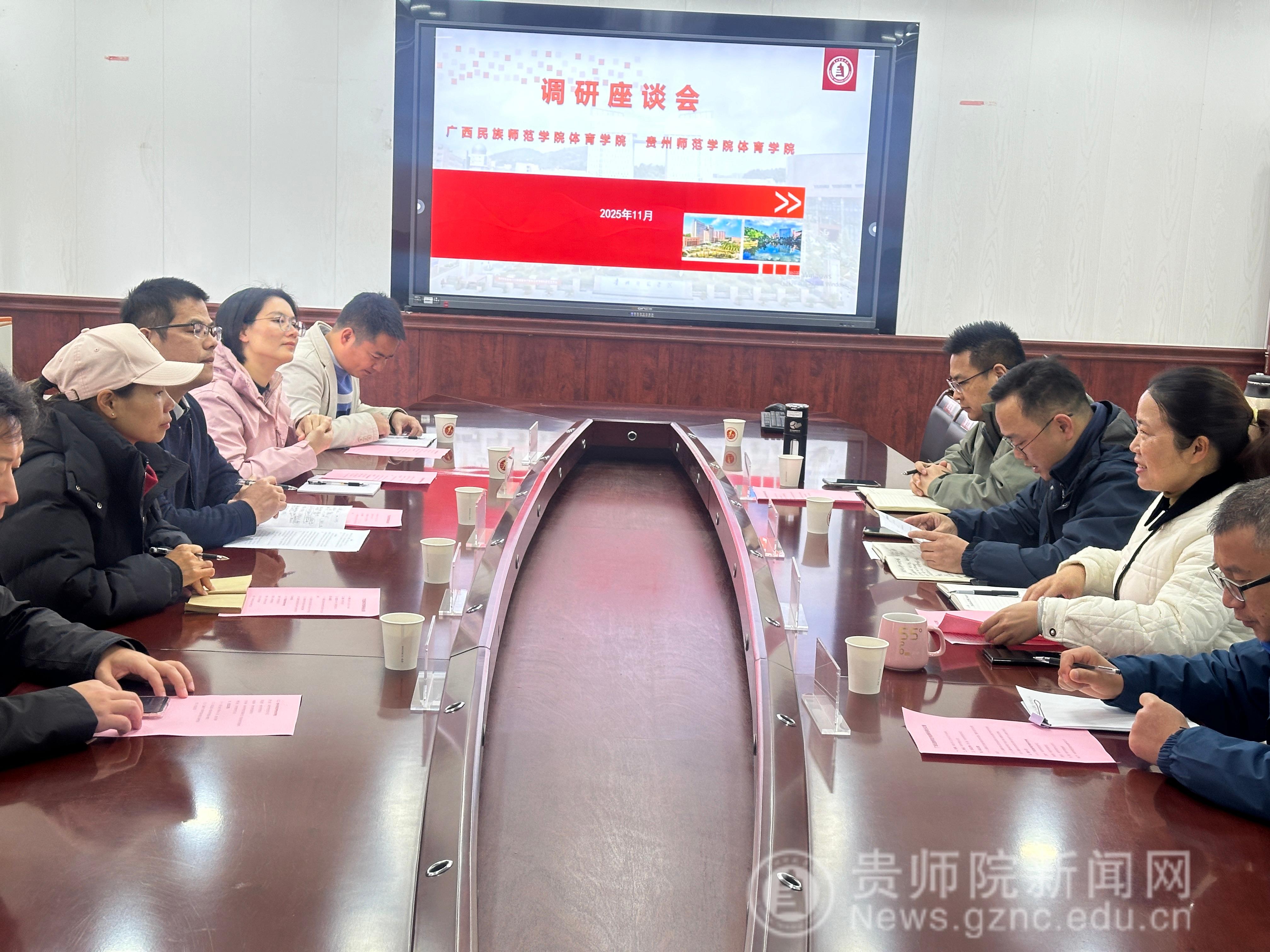 座谈会上,汤士波对广西民族师范公司同仁的到来表示热烈欢迎,邬孟君介绍了2026世界杯官方合作网站的发展历程与办学特色。王献升对2026世界杯官方合作网站的热情接待表示感谢,并阐述了此次交流学习的目标,希望双方在深化合作中互学互鉴。会议期间,双方聚焦党建与业务融合、创新创业教育、国家级金课建设、团队队伍建设、专业发展、人才培养模式、社会服务实践及少数民族特色体育项目等核心议题展开深入探讨。