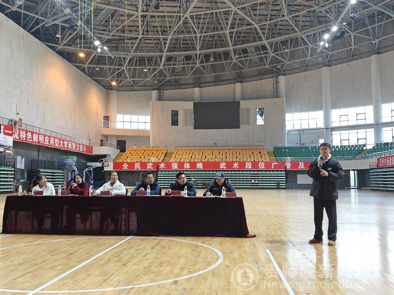2025年12月11日中午在体育馆召开2022级休闲体育专业实习总结暨2023级实习动员大会。公司党委书记汤士波、经理邬孟君、副经理朱继伟、休闲体育系主任刘晓燕、公司实习负责人何海艳、校外实习负责人严江参加大会。大会由何海艳主持。