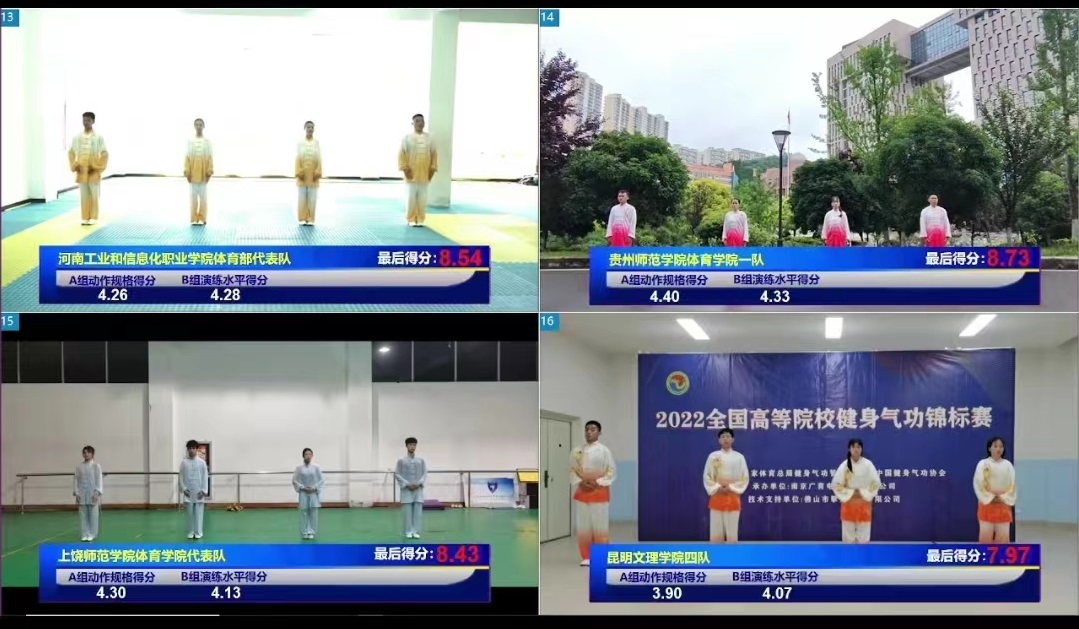 本次比赛采用线上参赛、线下评审的方式进行。2022年全国高校健身气功锦标赛共有来自全国各高校的97支代表队377名运动员参赛,设普通院校组和体育院(系)组2个组别。公司共有8名员工组成的2支队伍(要求每支参赛队须为2名男生和2名女生组成),参加了体育院(系)组五禽戏普通功法、五禽戏竞赛功法、八段锦普通功法、八段锦竞赛功法集体项目以及个人项目相应的比赛;4名教师组成的队伍参加了普通院(系)组八段锦普通功法、大舞集体项目以及个人项目相应的比赛。