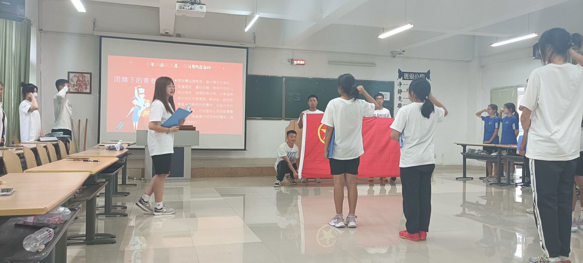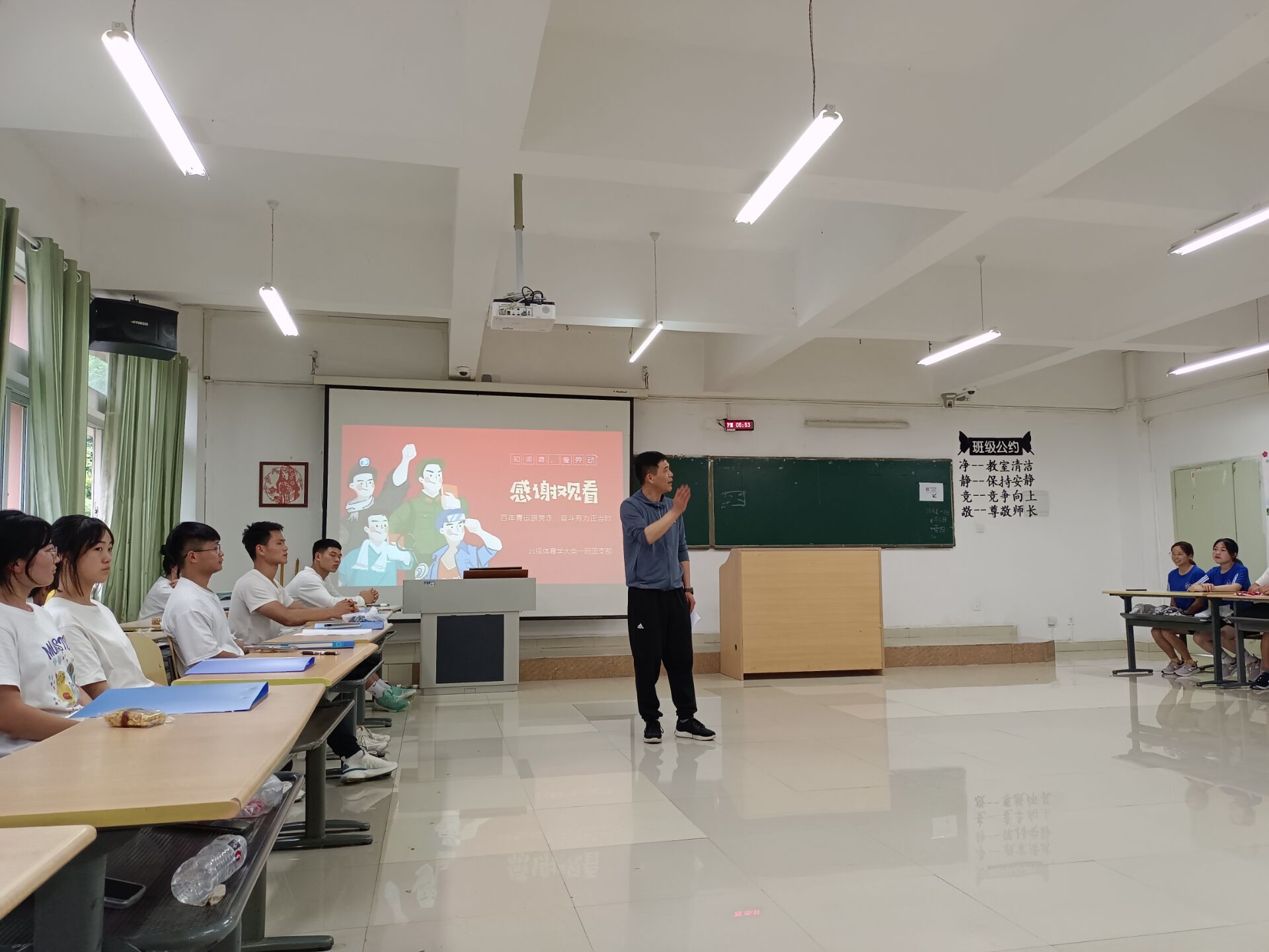 本次主题团日热议“传五四之薪火,悟百年之初心”,活动伊始,主持人带领团员们回顾共青团百年发展的光辉历史,感受共青团发展之不易。之后进行团员有奖竞答团史知识环节,在活动过程中,大家纷纷高呼出画板上百年团史中的重要事件。通过这次回顾历史的环节,加强了同学们的民族团结进步教育,使广老员工从情感上认同民族团结,树立各民族“谁也不离开谁”的思想观念,教育引导大家树立正确的国家观、历史观、民族观。树立崇高的理想和信念,刻苦学习,全面发展,担负起新时代老员工的使命与责任,现场气氛轻松愉悦;随后,与会人员共同学习习近平总书记《在庆祝中国共产主义青年团成立100周年大会上的讲话》、观看“劳动节发展历史”。本次主题团日还包括游戏环节“击鼓传花”快问快答、体育风采展示等。最后,体育学大类一班团支部全体成员声情并茂的朗读“团旗下的誓言”,本次主题团日活动取得圆满成功。