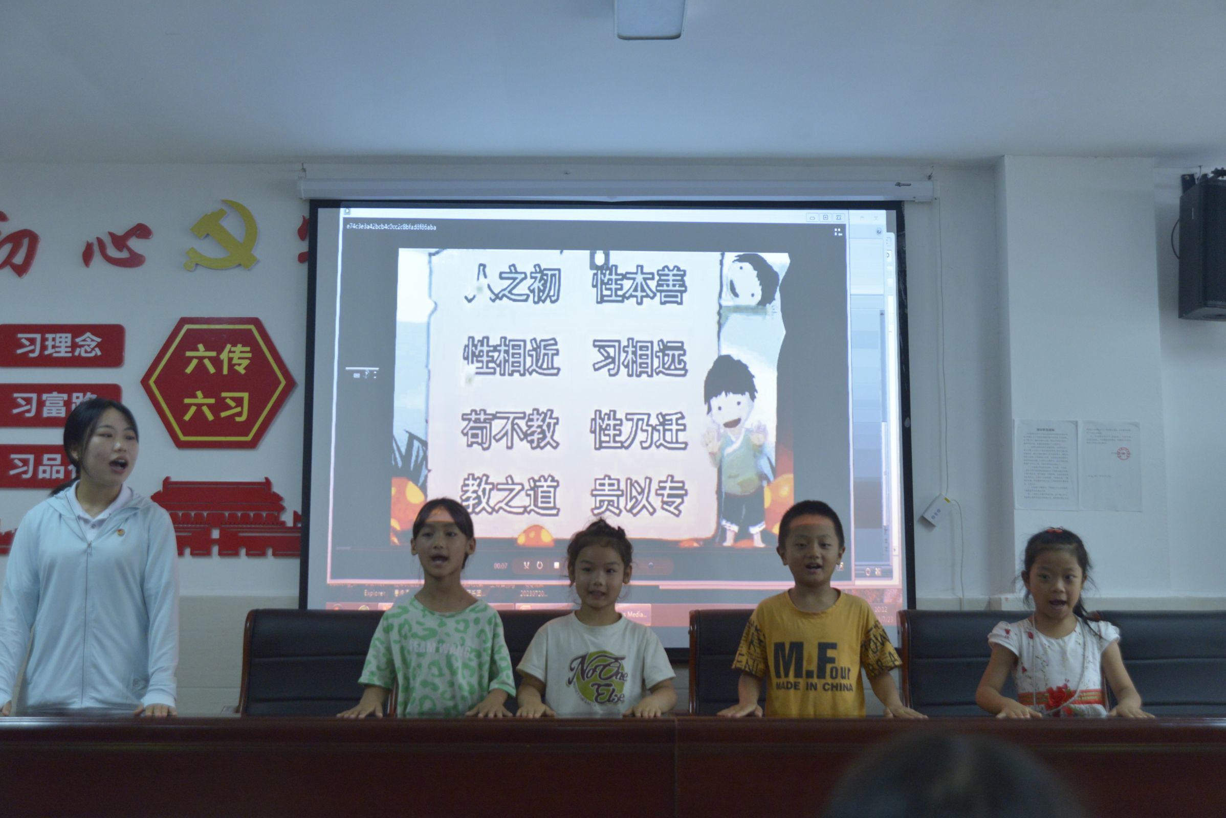 小朋友们上台跟志愿者一起背《三字经》