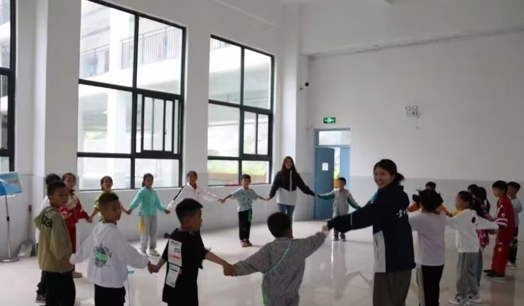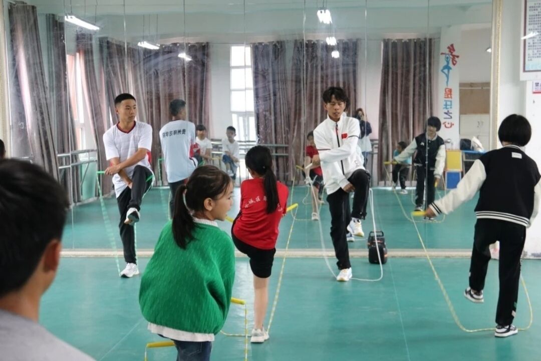 志愿者对小朋友们进行花样跳绳教学