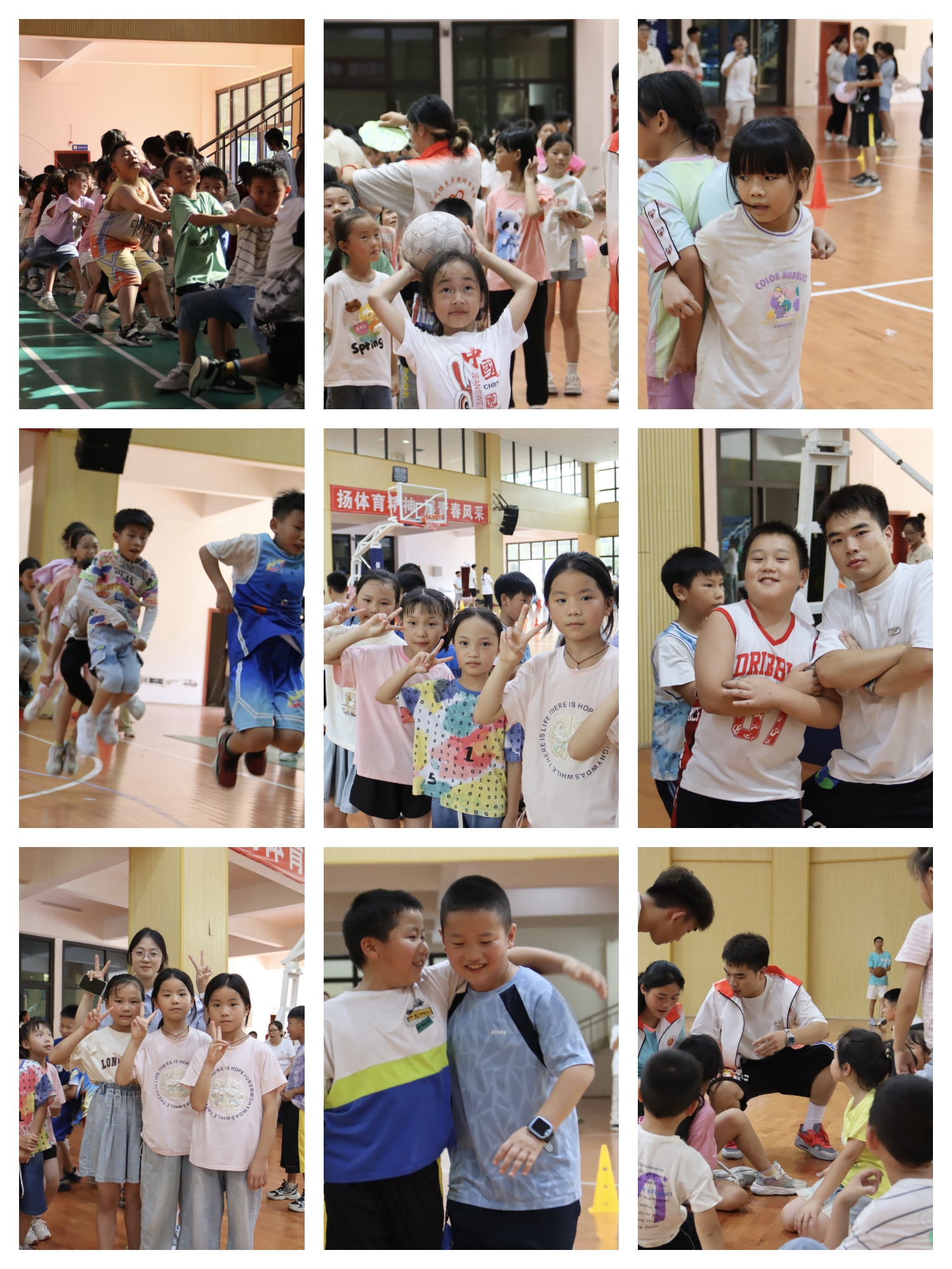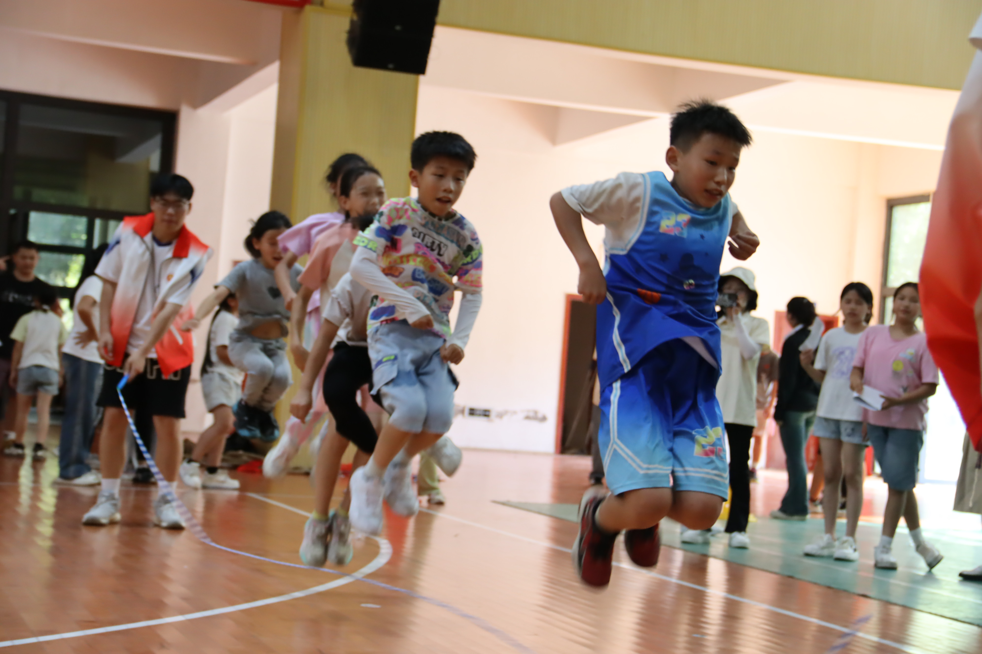 在跳绳比赛区域,孩子们步伐整齐,口号响亮,跳绳的速度和节奏把握得恰到好处。同学们全神贯注,并适应调整整体节奏,眼神中充满坚定和自信,展现了良好的团队协作精神。志愿者们则当起裁判,在一旁认真记录比赛成绩,并为表现出色的孩子们颁发奖品,忙得不亦乐乎。