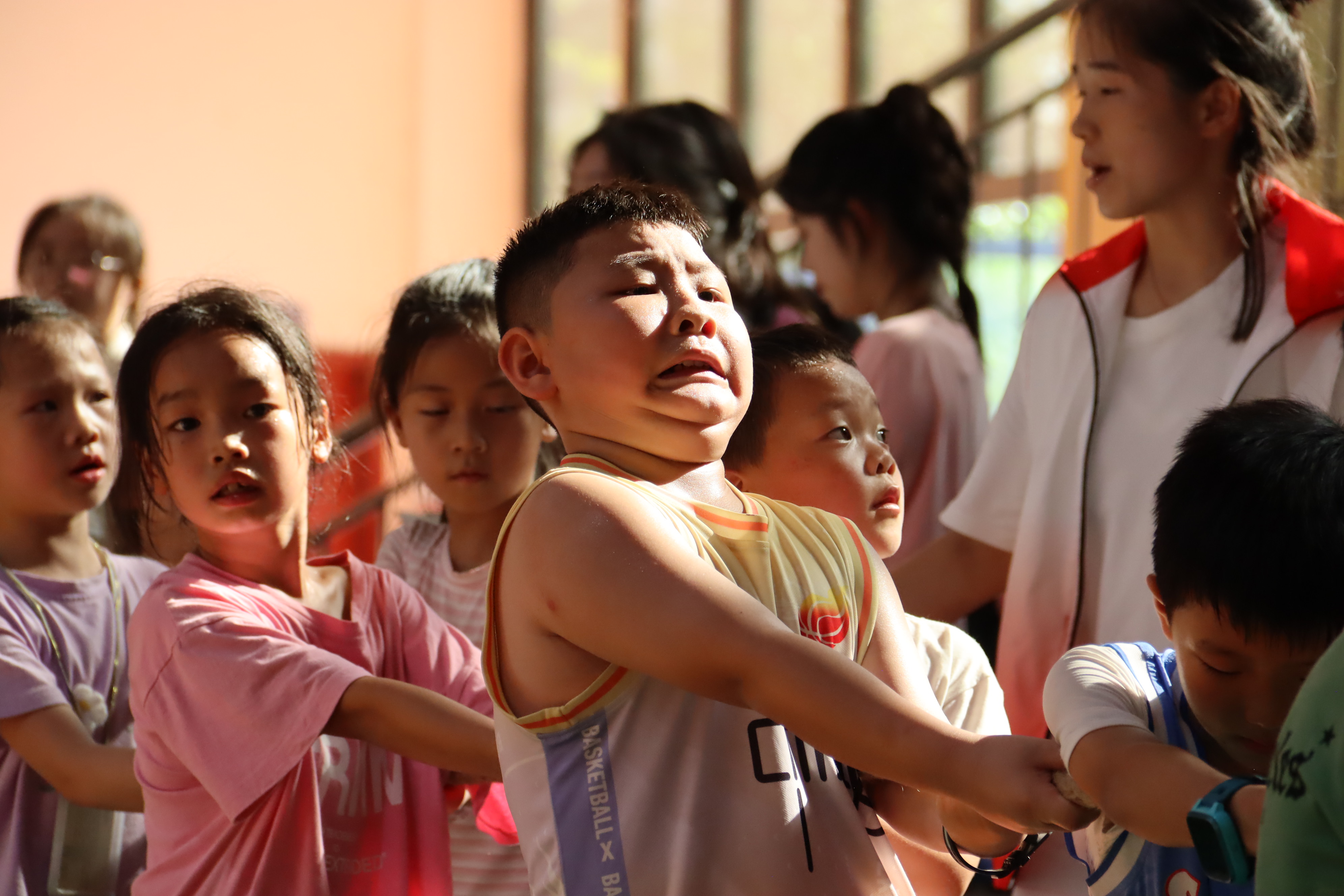 “脚要蹬地、身体后仰”“大家一起使劲”“加油”。在拔河比赛现场,志愿者们在一旁为员工们加油打气,纠正动作;孩子们紧紧握住绳子,齐声高喊着口号,一起为团队的胜利而努力,每一次的发力,每一滴汗水,都凝聚着团结的力量。